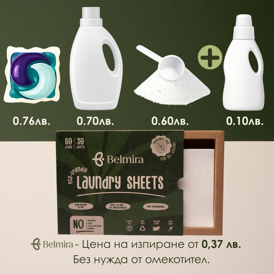 Η τοξική χημεία, που ονομάζεται απορρυπαντικό, χρησιμοποιείται από εταιρείες για τεράστια κέρδη. Οι κάψουλες «πλύσης» κοστίζουν από 75 σεντς έως και πάνω από 1 λέβα ανά πλύση. Με την Belmira, παρά την ασύγκριτα μικρότερη παραγωγή μας, έχουμε δημιουργήσει ένα ποιοτικό προϊόν που μπορείτε να αποκτήσετε σχεδόν σε διπλάσια τιμή.